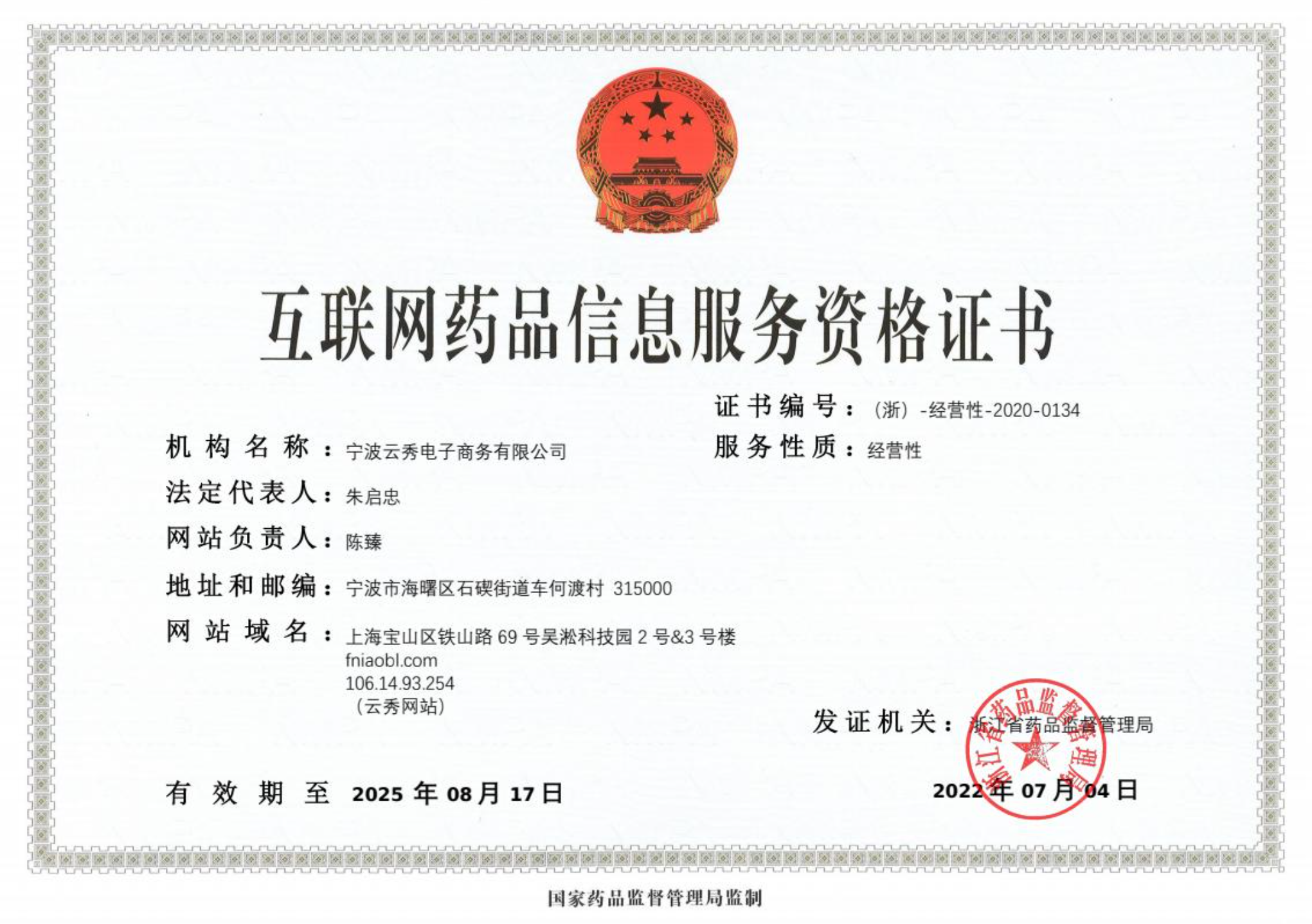 互联网药品信息服务资格证书:(浙)-经营性-2020-0134